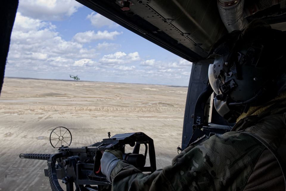 A Royal Marines aviation crewman manning a heavy machine gun onboard a Lynx helicopter [Picture: Corporal Jamie Peters RLC, Crown copyright]