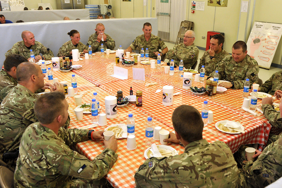 General Wall has supper with a group of soldiers [Picture: Corporal Si Longworth, Crown copyright]
