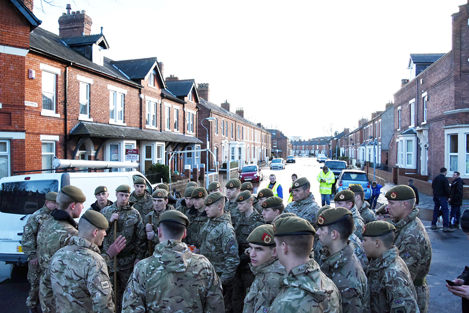 Soldiers from 2nd Battalion The Duke of Lancaster's Regiment help evacuate residents. Crown Copyright.