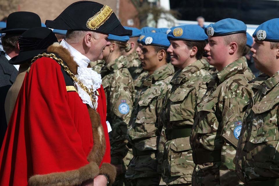 Wrexham's Lord Mayor, Councillor Ian Roberts, inspects soldiers of 101 Force Support Battalion Royal Electrical and Mechanical Engineers [Picture: Crown copyright]