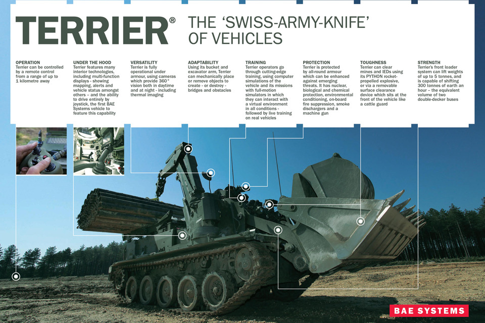 The Terrier vehicle is a great example of the contribution that the British defence industry makes to our Armed Forces. Designed and built in the UK by BAE Systems, it will provide technological advances for our troops with a more robust and versatile engineering capability.