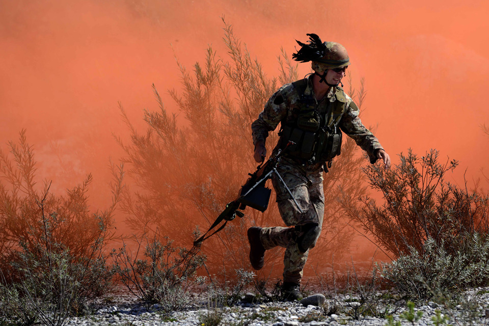 An Italian soldier runs in front of concealing coloured smoke [Picture: Corporal Andy Reddy, Crown copyright]