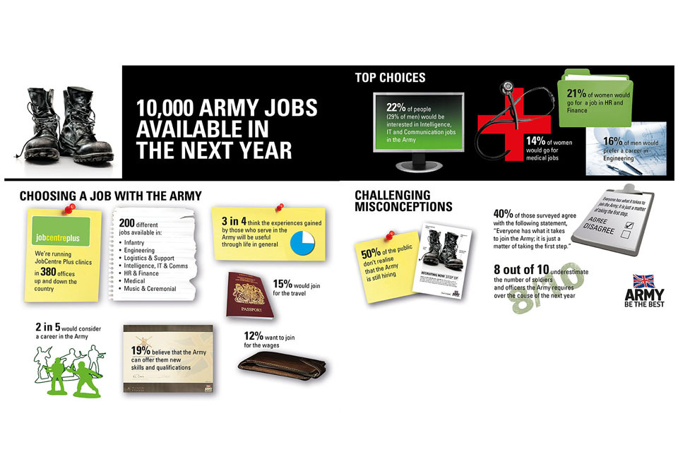 The campaign will also capitalise on social media including Facebook and Twitter, where potential recruits can quiz current soldiers about their careers in the Army. Printed toolkits will also be provided to support the Army’s regional recruitment surges.
