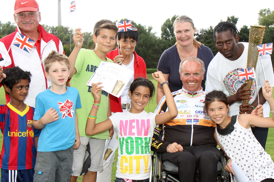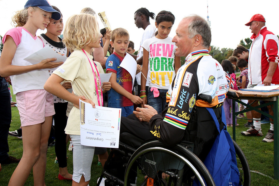 Schattauer won two bronze medals in London and a gold medal in Beijing in the Handbike Race. Two weeks after the Mini-Olympics in Vienna, he competed in the World Paracycling Championships in Canada, coming 7th in the Road Race. Schattauer happily answered the children’s questions and told them about his experience in London last year.