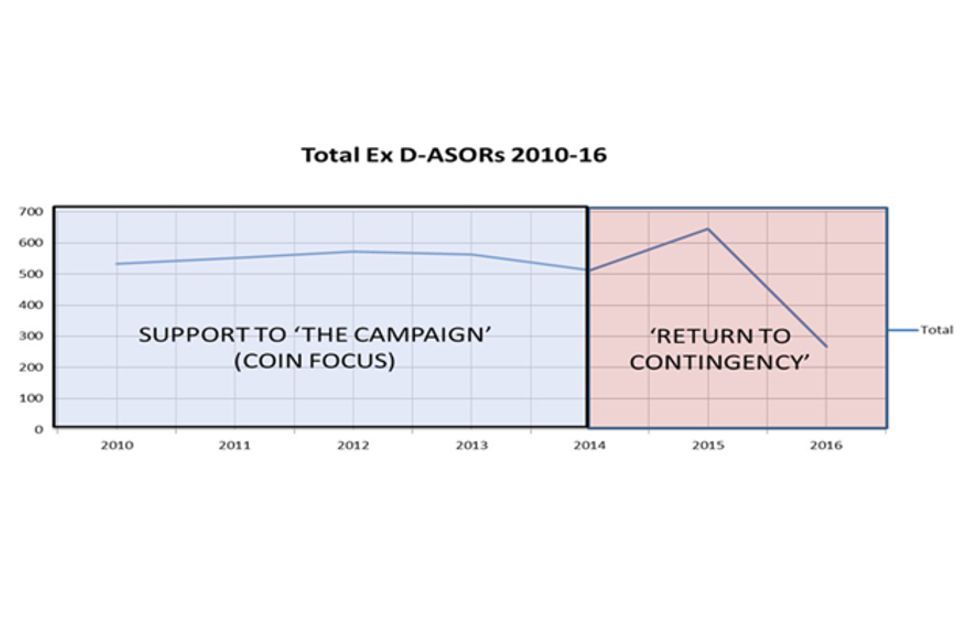 To capture and understand air safety issues on exercise it was decided to bracket the data by time, and to identify air safety issues from aviation exercises between 2010 and 2016. This time window is of particular interest as it focuses on both aviation exercises supporting Op HERRICK 2010-14 (MST and environmental) and aviation’s switch to more contingency era operations from circa 2014 to date. Given the increased importance of Air Land Integration (ALI) capabilities post Op HERRICK, Op ELLAMY, Op TELIC and a focus on the ‘whole force’ approach to operations (CJIM-Combined Joint, Inter agency and Multinational), a broader and more complex set of exercise scenarios has developed which may suggest the spike in reporting form 2014. It was also noted that due to continuing operations such as Op SHADER not all forces have been able to return to contingency, which may account for gaps in exercise reporting from some force elements.