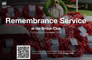 The annual Remembrance Day Service organised by the British Embassy in Bangkok will be held at The British Club commencing at 10:50am on Sunday 9 November 2025. The event will not only commemorate British, Commonwealth, and allied personnel, but all those who have been affected in all conflicts. It serves as a reminder that nations who fought so bitterly against each other can come together to promote peace and stability in the modern world.