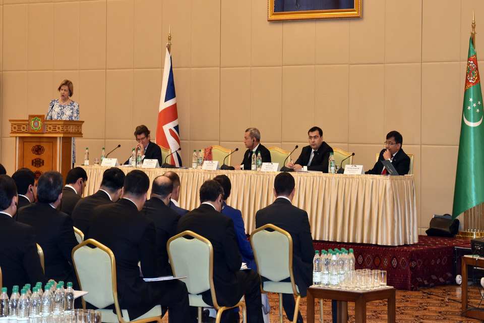 During the third day of the UK Prime Minister’s Trade Envoy’s visit to Ashgabat, the 5th meeting of TUKTIC took place with Ambassador Ronald Nash, Co-Chair of TUKTIC giving the opening remarks and Baroness Nicholson the key note speech. The Baroness noted that the “UK can be a trusted and world class partner for Turkmenistan” and that the UK’s approach to building partnerships across the world can help Turkmenistan be competitive in a globalised world. The seminar which followed involved all the visiting British companies and representatives from various Turkmen Ministries to discuss cooperation in a range of sectors such as finance, banking, education, science, energy, construction, aviation, communication and sports. Representatives from the UK underlined in particular their readiness to support Turkmenistan’s preparations for the Asian Indoor & Martial Arts Games in 2017.