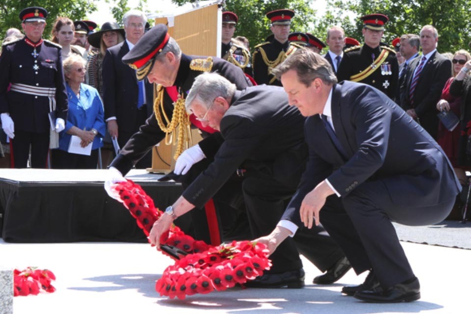 The Prime Minister David Cameron, The Chief of Defence Staff General Sir Nicholas Houghton and Mr Peter Andrews, father of Flight Sergeant Gary Andrews, 120 Squadron, Royal Air Force lay wreaths at the memorial
