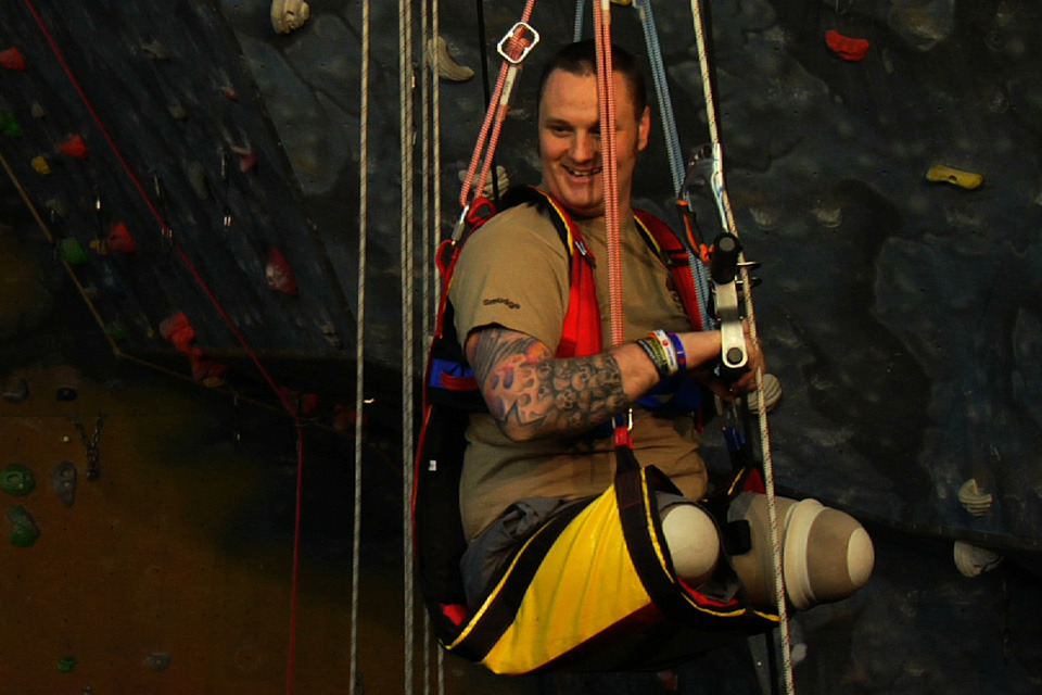 Sapper Clive Smith is hoisted onto a specially adapted climbing wall at the Battle Back Centre (Lilleshall) [Picture: via MOD]
