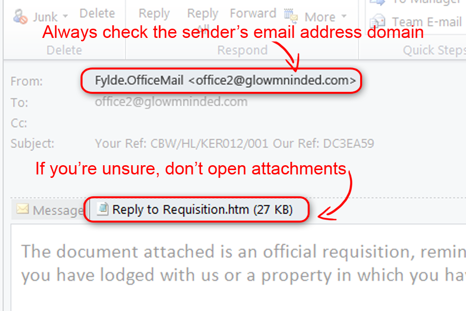 Current phishing emails are using our office names but are being sent from other email domains, eg Fylde.OfficeMail [office2@glowmninded.com] as shown below.