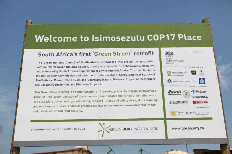 Funded by the British High Commission in South Africa, the historic township of Cato Manor in Durban was the location for South Africa’s first ‘Green Street’ upgrade in a low-income area. Completed ahead of the COP17 international climate change talks in late 2011, thirty low-cost houses in a small cul-de-sac road received a green upgrade, otherwise known as a retrofit. 26 more houses were completed after COP 17. It was the first comprehensive green street ‘retrofit’ in a low-income housing area in South Africa. “We wanted to demonstrate how green houses can contribute to a better quality of life and we have achieved this,” says Sarah Rushmere, Special Projects Manager at the GBCSA.