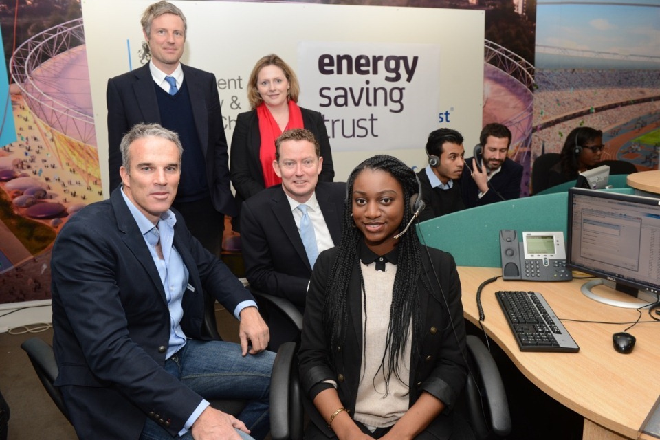 Minister Greg Barker, Zac Goldsmith, Mary Macleod, Lewis Pugh and Oliver Heath with ESAS call handler at the Energy Saving Advice Service.