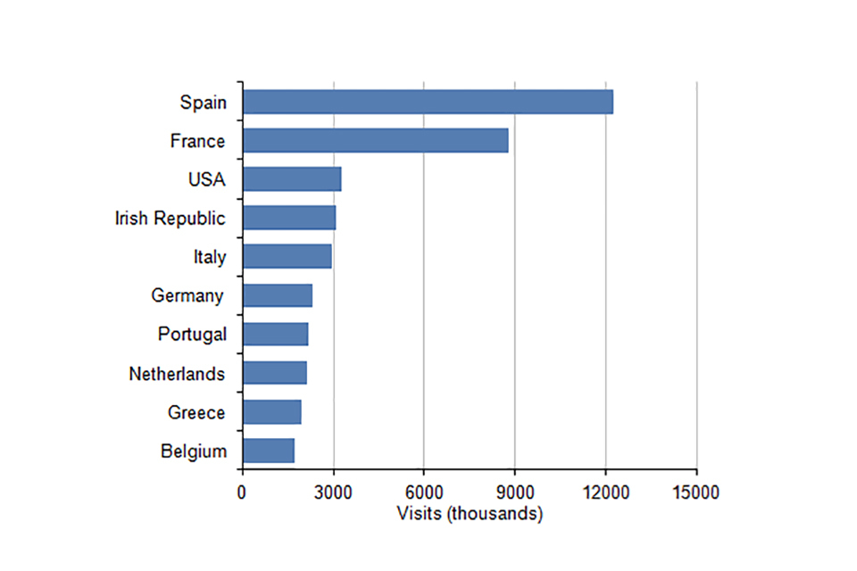 Top 10 countries visited by UK residents for at least one night: