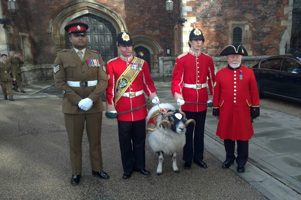 Sergeant Johnson Beharry VC with soldiers of the Mercian Regiment and their Regimental ram, the mascot of the regiment
