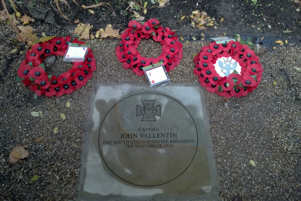 John Vallentin was a 32-year-old captain in the 1st Battalion of The South Staffordshire Regiment. On the 7 November 1914, Captain Vallentin, who was in temporary command of the battalion, led an attack on a trench near Zillebeke, Ypres. Despite being severely wounded he pressed on with the attack before succumbing to machine gun fire.