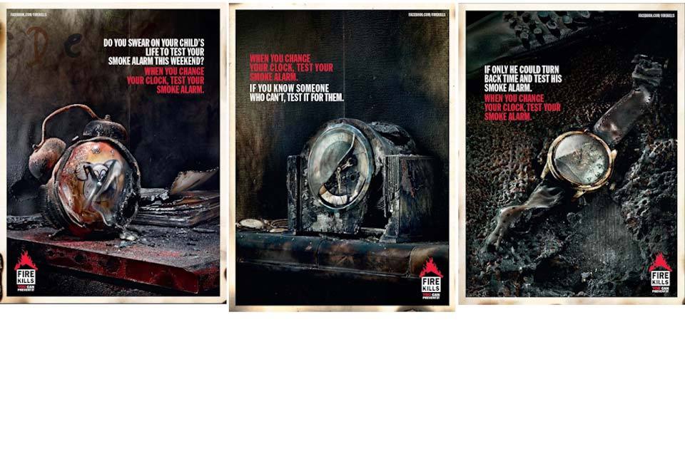 - images: a striking range of images of charred timepieces that bring to mind a child’s bedside table, a grandparents’ mantelpiece, and a quiet night in front of the TV, emphasising the link between the clock change and the need to test your smoke alarm