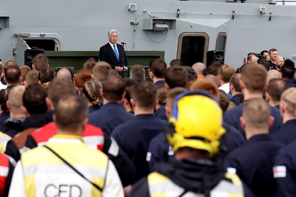 The Defence Secretary addressed the Royal Navy crew and industry personnel on the deck of the new aircraft carrier last month.