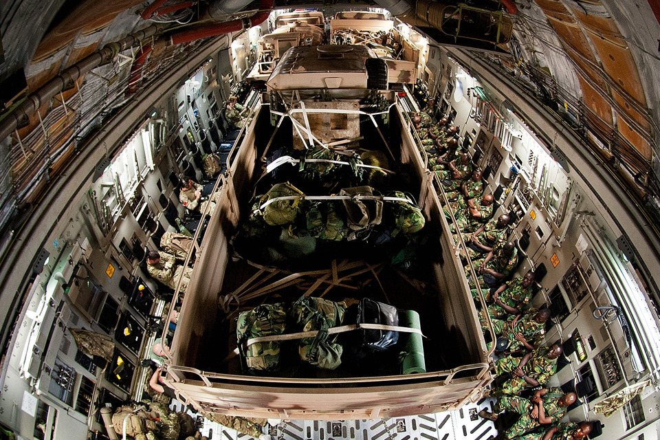 A fully loaded RAF 99 Squadron C-17 aircraft carries the first deployment of Ghanaian troops into Mali [Picture: Sergeant Ralph Merry RAF, Crown Copyright/MOD 2013]