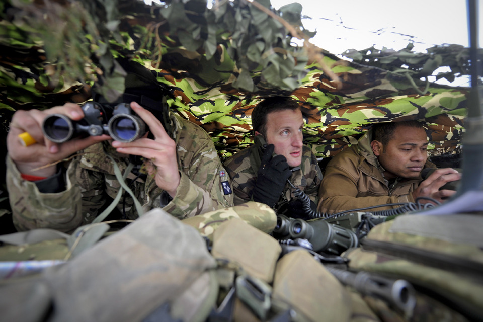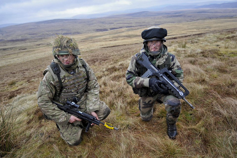 British and French soldiers man an observation post as part of a Fire Support Team on a hill in the Otterburn Training Area [Picture: Sergeant Brian Gamble, Crown copyright]