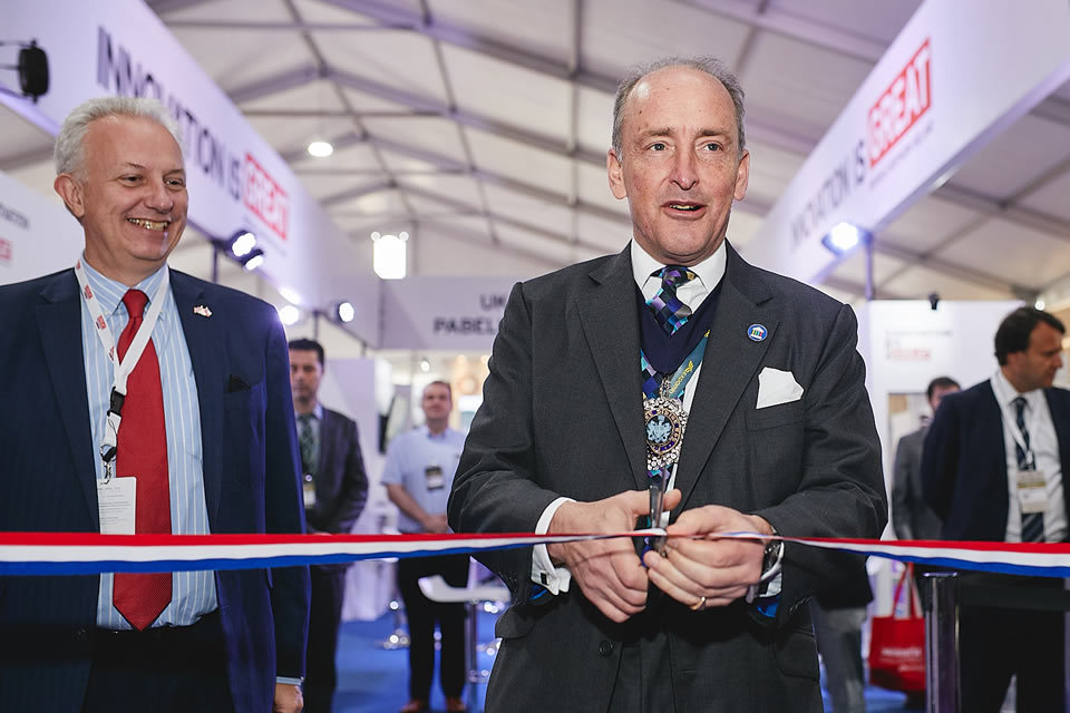 Picture of Charles Bowman cutting the tape to inaugurate the British Pavilion at Expomin 2018.