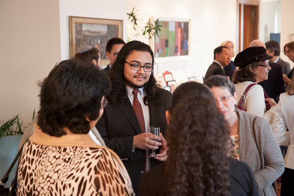 Nico Montano and his family talk with selection committee member Professor Carol Berkin.