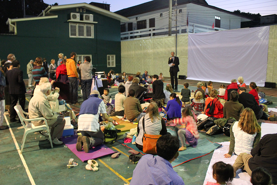 Guests at Thursday’s screening were encouraged to bring their own seating and picnic and the embassy provided mats to sit on in the tennis court. As the guests were settling down, Helen Ward of Jack Drum Arts and Kids for Kids UK and Margarete Magiera from Vientianale International Film Festival unveiled an innovative compact pedal-powered cinema kit, consisting of two bicycle generators which charge a battery that feeds into a film projector.