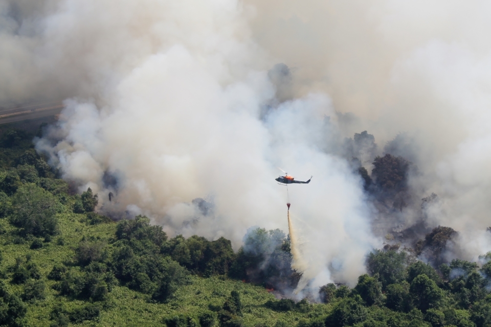 On Wednesday 25 March, two 7 Flight AAC Bell 212 helicopters from the British Garrison were mobilised to help support the Belait District’s Disaster Management Centre’s fire fighting efforts. This followed a request from the Brunei Fire and Rescue Department to the British Defence Adviser to Brunei Darussalam, Colonel Mike Page RM. Efforts to fight the fire from the land had been hampered by lack of access to the forest area of Mumong Highway in Kuala Belait.