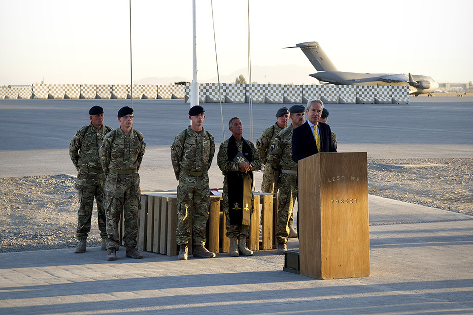 Sir Richard Stagg, British Ambassador to Afghanistan says the final fews words before the lowering of the Union Flag [Picture: Corporal Andrew Morris (RAF), Crown copyright]