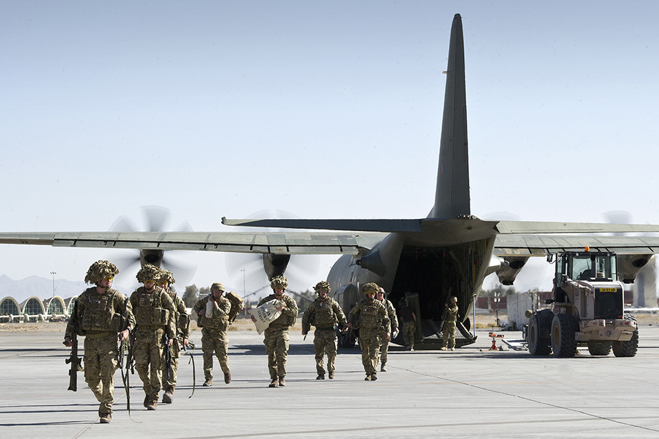 British military personnel arrive at Kandahar Airfield from a Hercules transport aircraft having departed Camp Bastion for the final time time [Picture: Corporal Andrew Morris RAF, Crown copyright]