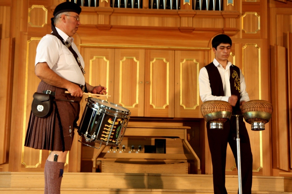 On 17 June a joint performance between visiting London Scottish Regiment bandsmen and the “Sogdiana” musicians of the Uzbekistan State Chamber Orchestra of National Instruments captivated an audience at the State Conservatory of Uzbekistan.