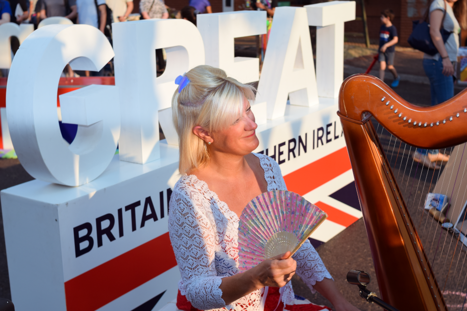 Harpist Anita Aslin fans herself next to her harp, in front of a GREAT Britain and Northern Ireland sign.
