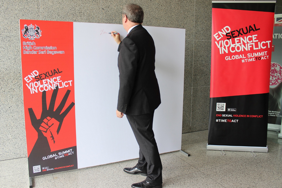 Guests signed a ‘End Sexual Violence in Conflict’ board in red ink and took a group photo in front of Kampung Ayer with ‘End Sexual Violence in Conflict’ banners to show their support for the initiative and the Global Summit. Videos of the Foreign Secretary William Hague and Special Envoy for the UN High Commissioner for Refugees, Angelina Jolie as well as an animation entitled “Don’t believe the thumbnail, this video is the stuff of nightmares” that was commissioned by the Foreign and Commonwealth Office.