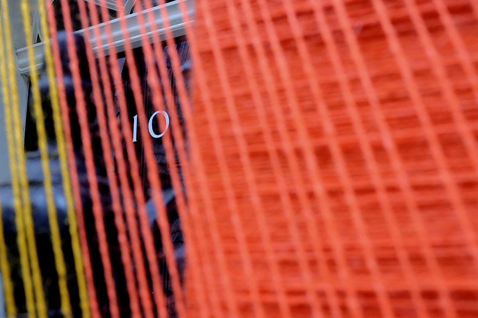 Close up image of the No10 door through the orange string of the Pride art installation.