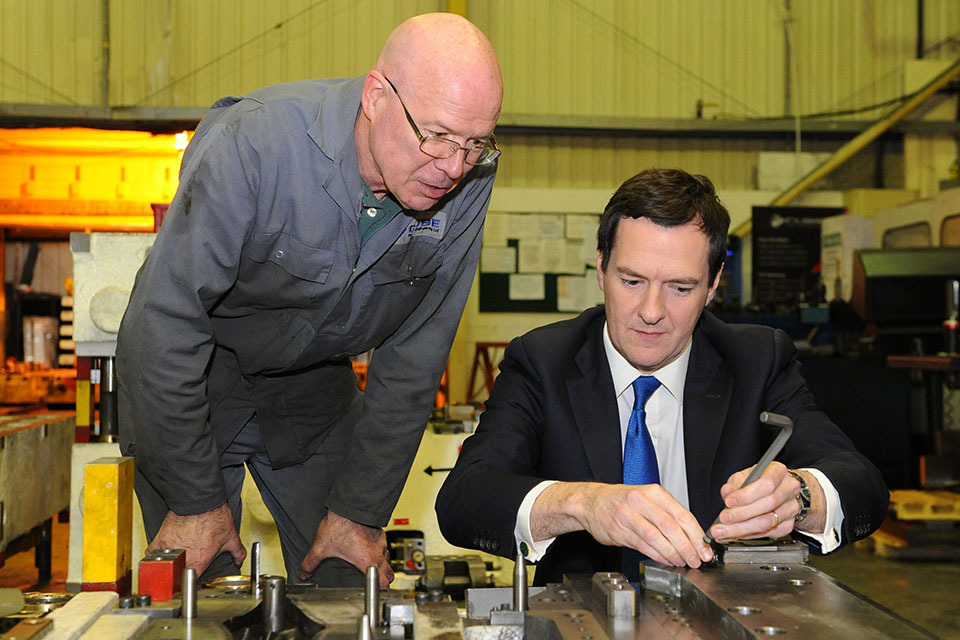 Chancellor with chargehand Paul Wicket during a visit to Cube Precision Engineering in Rowley Regis