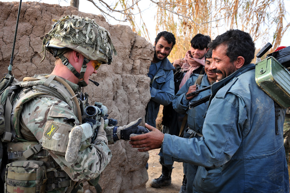 A British soldier shares a joke with members of the Afghan Uniform Police during a patrol (library image) [Picture: Corporal Mike O'Neill, Crown copyright]