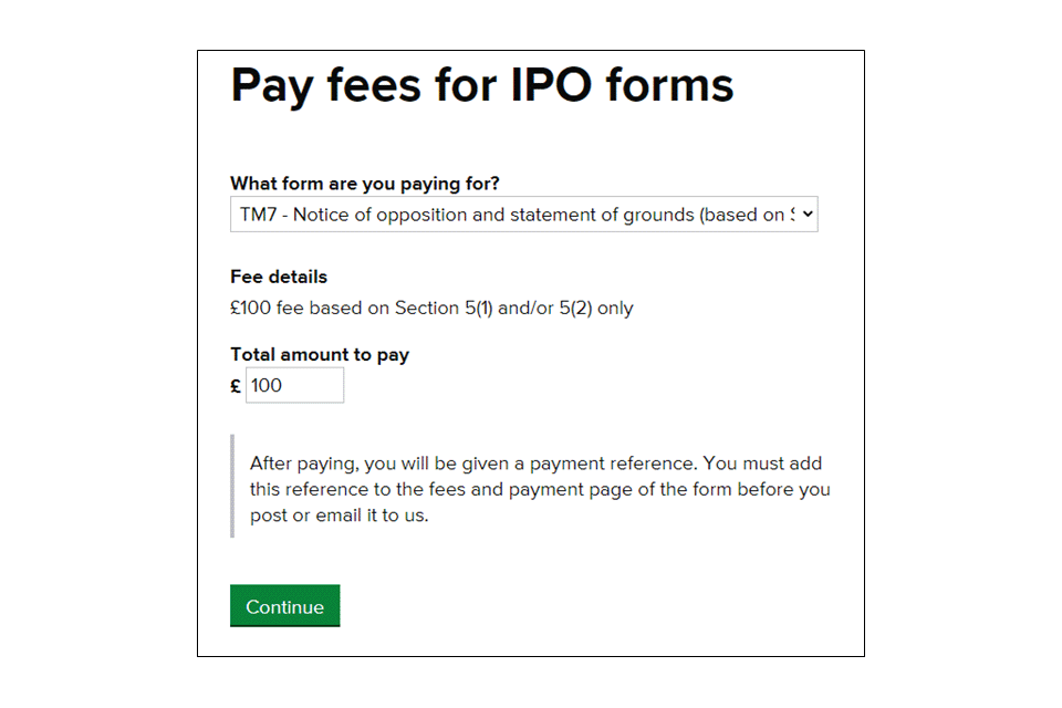You will now have to select whether you are paying the IPO for a patent, trade mark, design or another service. Once you have made your selection, you will be asked to choose which form you are paying for. You will then see appropriate information about the fee related to that form.