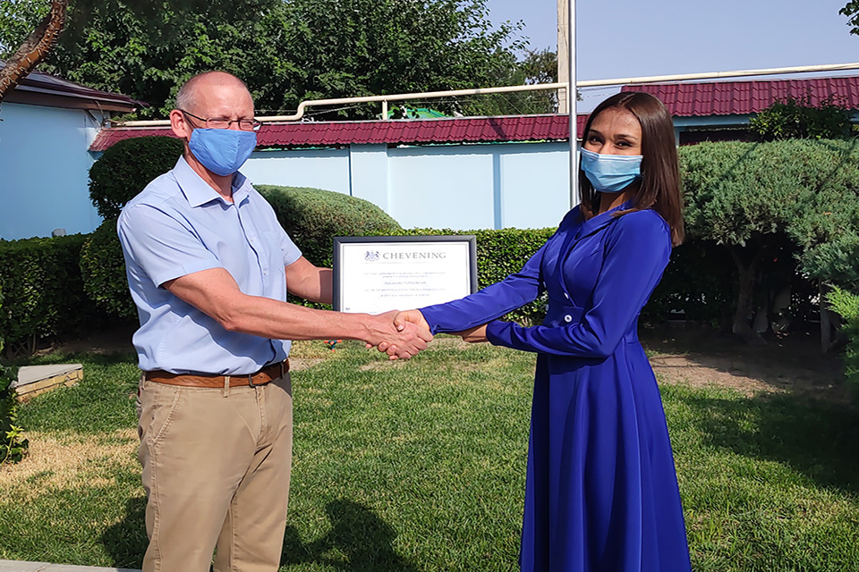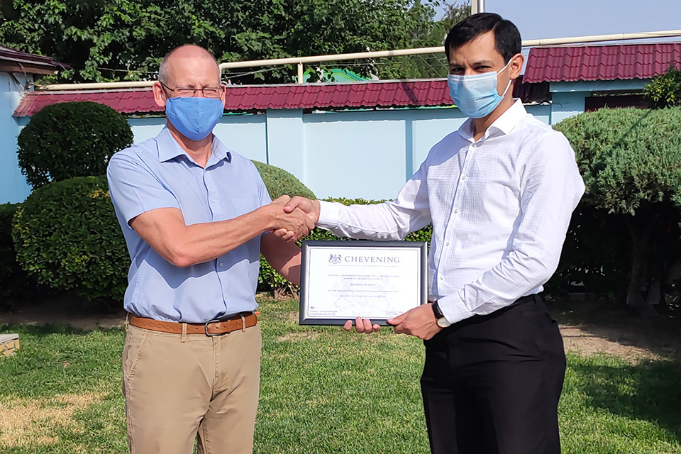 Welcoming the new awardees to tea and coffee at the British Ambassador’s recently renovated residence garden, the British Chargé d’Affaires Mr David Pert congratulated Guljahan Tursunova, Bahram Atayev and Merdan Altyyev on their awards and highlighted the importance of Chevening in shaping the future of young leaders from around the world. He then presented each scholar with a certificate confirming their award and wished them every success in their academic adventures.