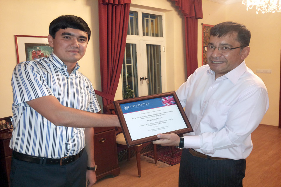 Chevening scholar Meylis Garryyev receives certificate from HM Ambassador Sanjay Wadvani