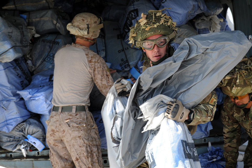 Troops unload bags of Christmas mail from the UK at Camp Bastion, Afghanistan (library image) [Picture: Corporal Mike O'Neill, Crown copyright]