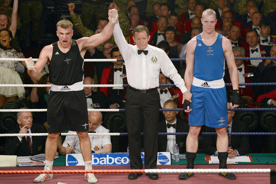 Private Joe Allen is declared the winner over Private James English, sealing the win for 3 PARA in the very last bout of the championship final [Picture: Corporal Obi Igbo, Crown copyright]