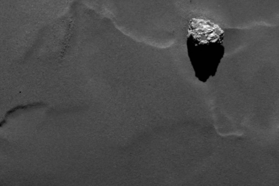 Close-up of the boulder Cheops as it casts a long shadow on the surface of comet 67P/Churyumov-Gerasimenko. Credit: ESA/Rosetta/MPS for OSIRIS Team MPS/UPD/LAM/IAA/SSO/INTA/UPM/DASP/IDA.