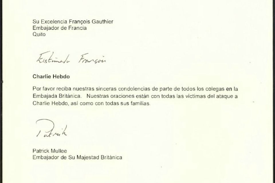 British Ambassador Patrick Mullee sent a condolences letter to the French Ambassador, Francois Gauthier, and on Monday he payed a visit to the Embassy of France in Quito, to sign the book of condolences after last week’s Charlie Hebdo attack in Paris. Ambassador Mullee presented his note of solidarity and strong support to the people of France, as well as to the families of the victims.