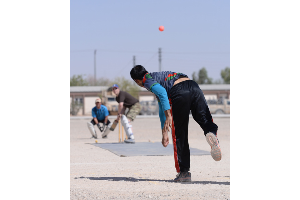 A member of the Afghan team bowls to a waiting British Army batsman [Picture: Sergeant Barry Pope, Crown copyright]