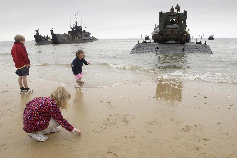Children play on the beach at Arromanches, or 'Sword Beach', in front of Royal Logistic Corps landing craft and mexifloats (library image) [Picture: Giles Penfound, Crown copyright]