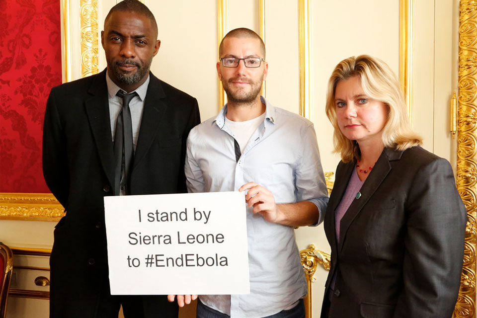 Actor Idris Elba, British nurse and Ebola survivor Will Pooley with International Development Secretary Justine Greening at the 'Defeating Ebola in Sierra Leone' conference. Picture: Jessica Lea/DFID