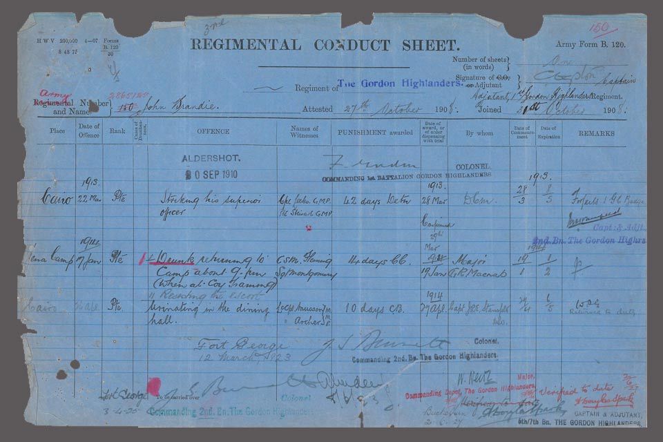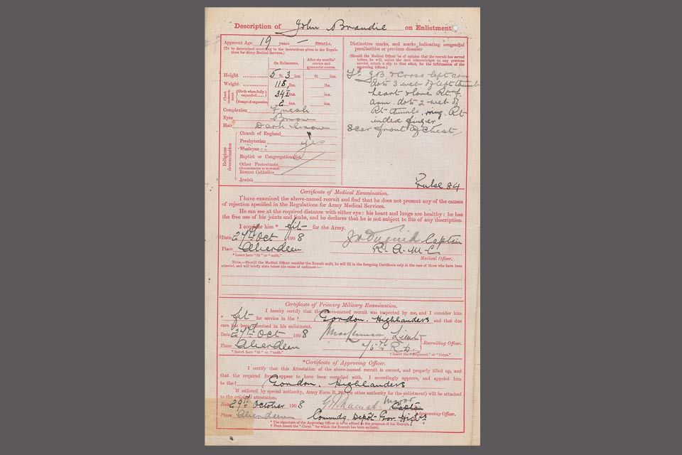 The son of a farm worker, John Brandie was born in Aberdeen on 1 July 1890. He enlisted into the 1st Battalion Gordon Highlanders in 1908, having previously worked as a Town Carter. Having survived the Battle of Passchendaele and the First World War, he became a Postal Worker and subsequently a Commercial Clerk. John Brandie died in Aberdeen on 22 Dec 1954.