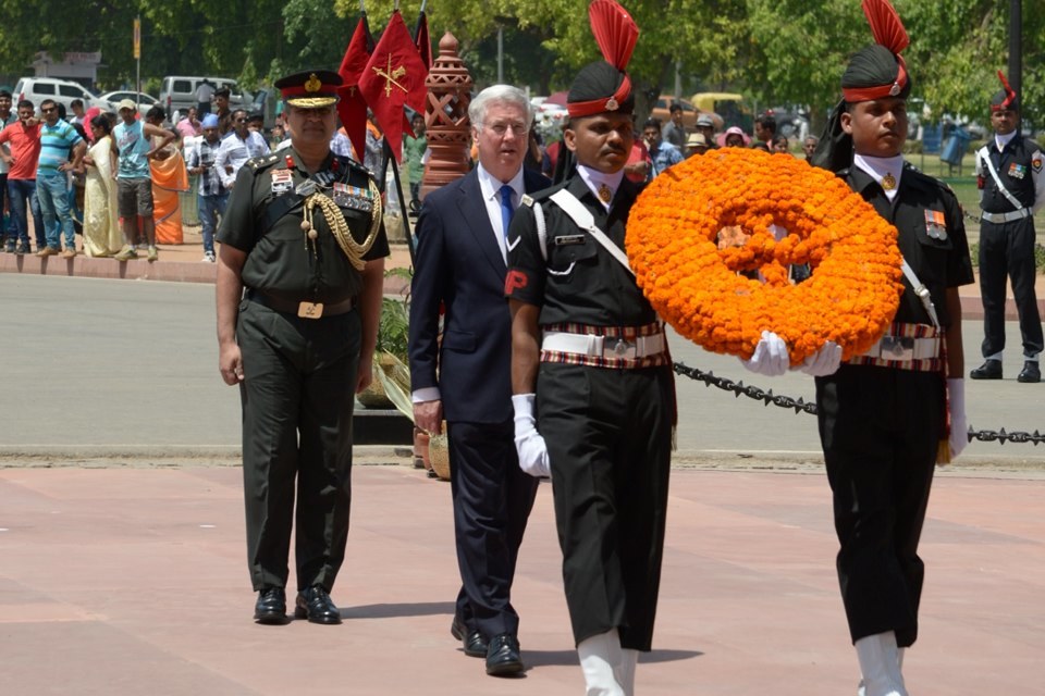 Defence Secretary Sir Michael Fallon laid a wreath at India Gate to honour the 74,000 Indians who served and died in the Second World War. Crown Copyright.