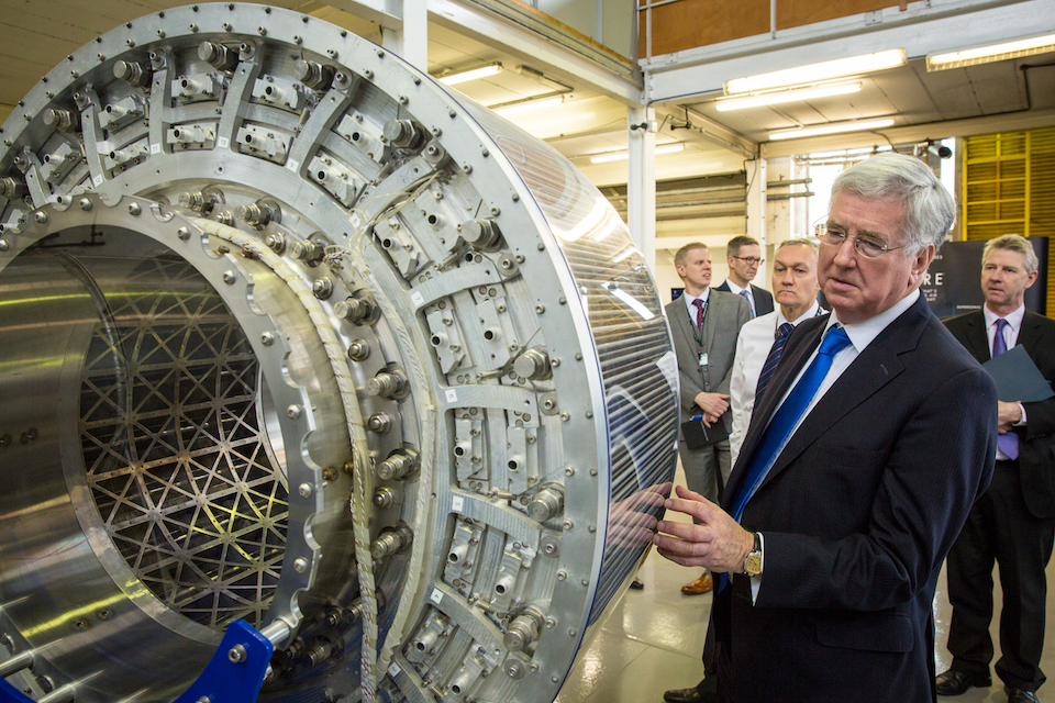 The Defence Secretary with a heat exchanger, a component part of the SABRE (Synergetic Air-Breathing Rocket Engine) at Reaction Engines in Culham Science Park in Oxfordshire. Crown Copyright.