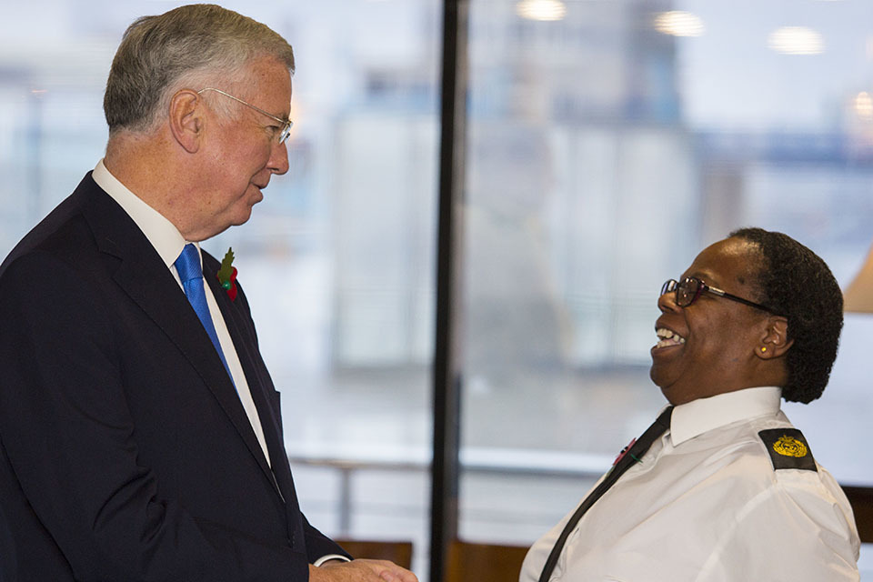Sir Michael Fallon met the unit’s engagement team, who have been specifically set up to build links with minority communities across London, and congratulated the Royal Navy’s longest serving female reservist Chief Petty Officer Evadne Gordon who joined 40 years ago and whose family moved from Jamaica to the UK in the 1950s.
