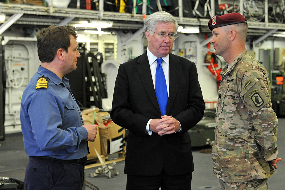 The Defence Secretary met UK personnel on board as well as representatives of other nations’ armed forces stationed aboard the British vessel during the exercise. Mr Fallon was briefed on HMS OCEAN’S role and her capability to launch helicopter-borne assaults and landing craft carrying Royal Marines and armoured vehicles.